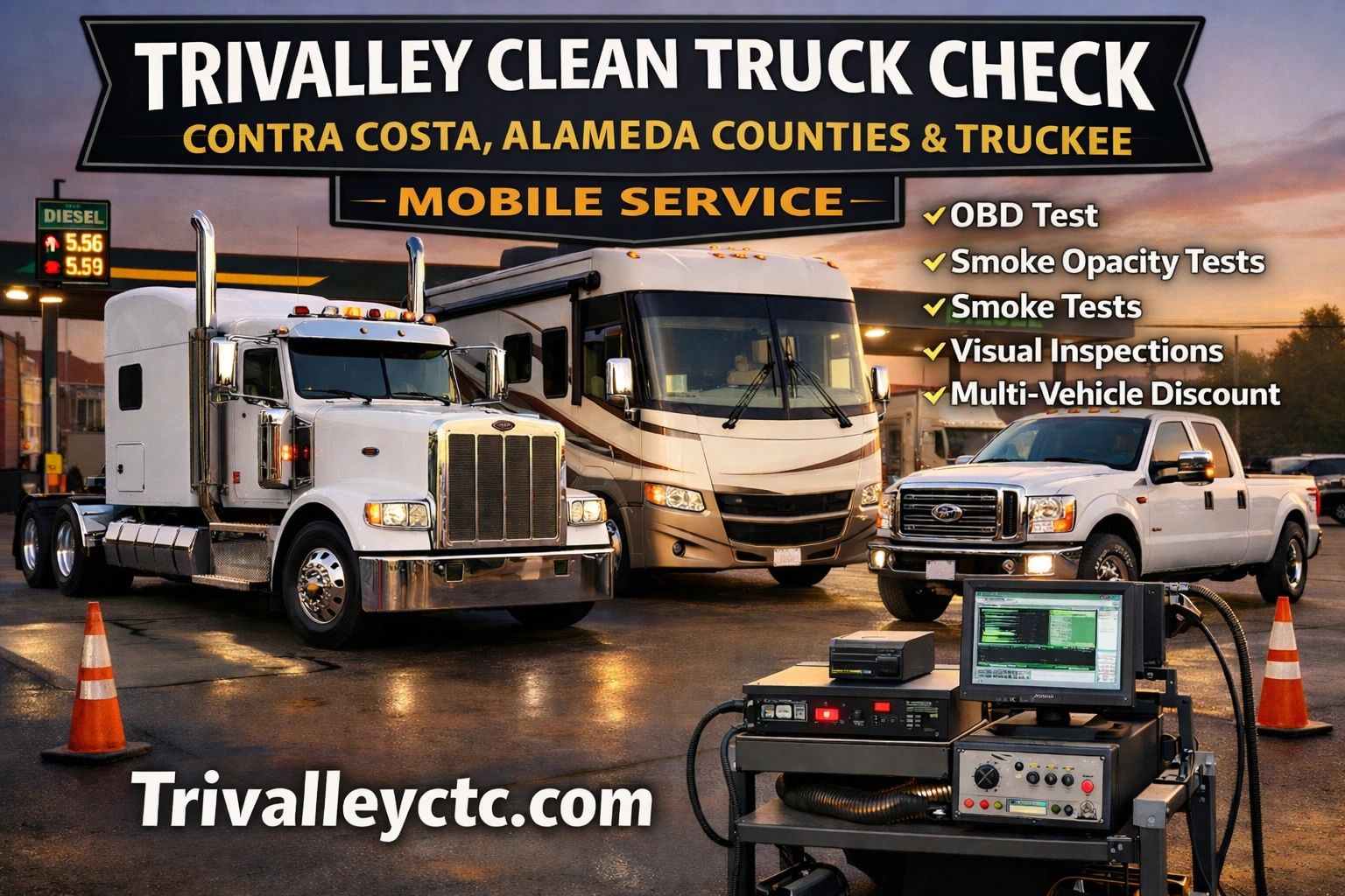 Tri-Valley Clean Truck Check provides mobile CARB Clean Truck Check testing for diesel trucks, fleets, and diesel motorhomes